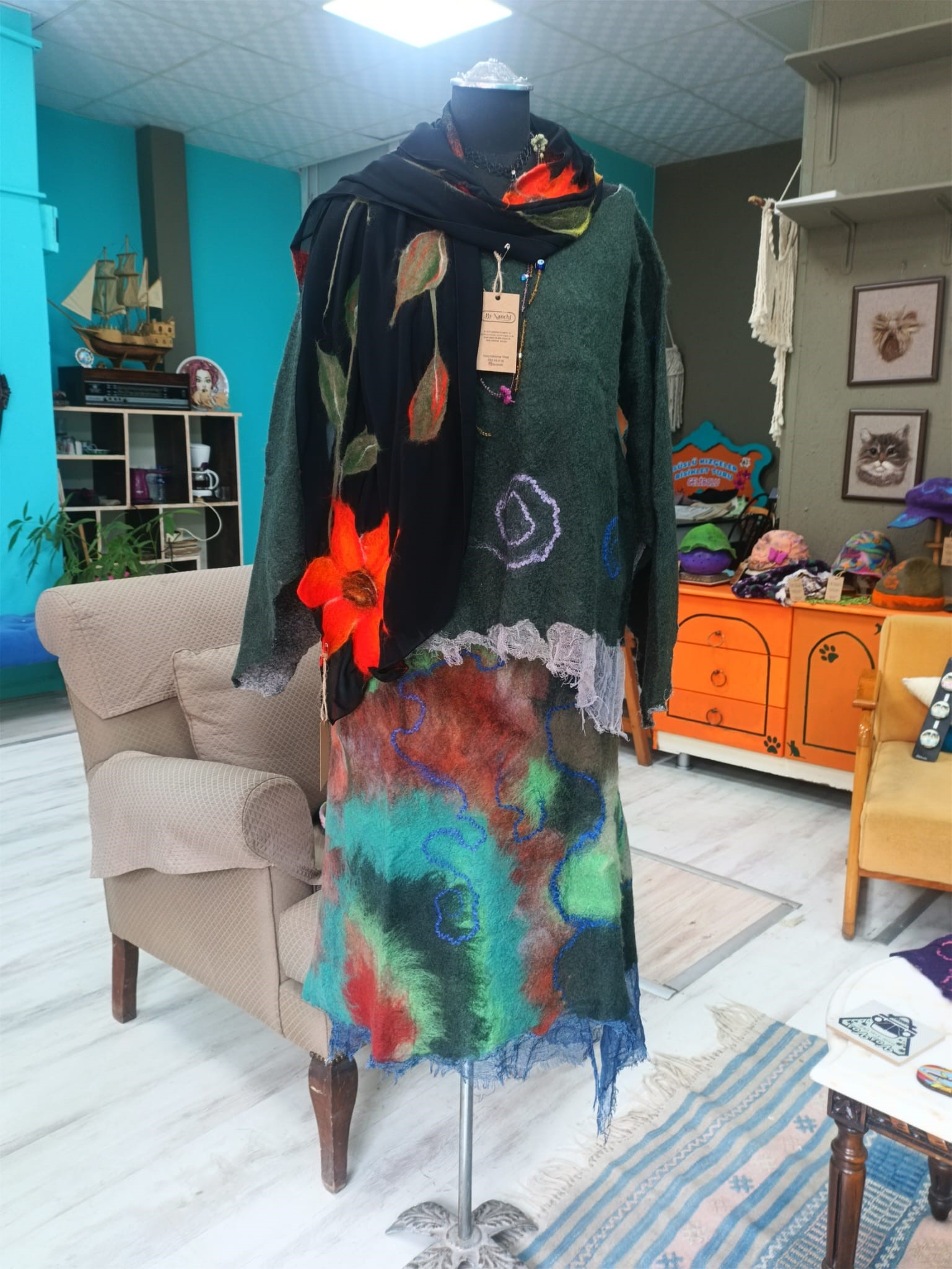 Şalın ayçiçeği motiflerinde yer alan keçe işlemeler, hem şalın dokusuna hem de görselliğine derinlik katar. Bu dokuların harika bir uyum içinde olması şalı çok daha ilgi çekici hale getiriyor. Üstelik bu keçe işlemeler, şalın daha uzun ömürlü olmasını sağlıyor. Kaliteli keçe ve şifon kumaşın birleşimiyle ortaya çıkan bu şal, kullanıcılarına yıllarca birlikte olmak için tasarlanmıştır.
