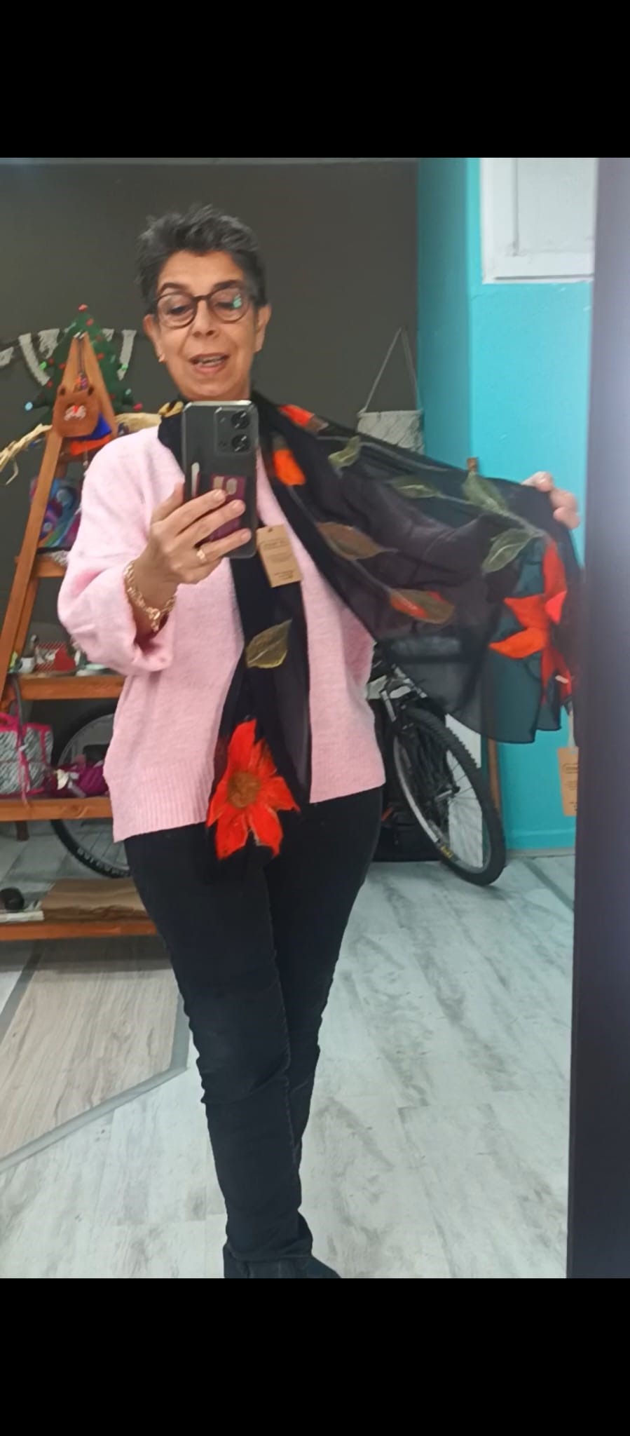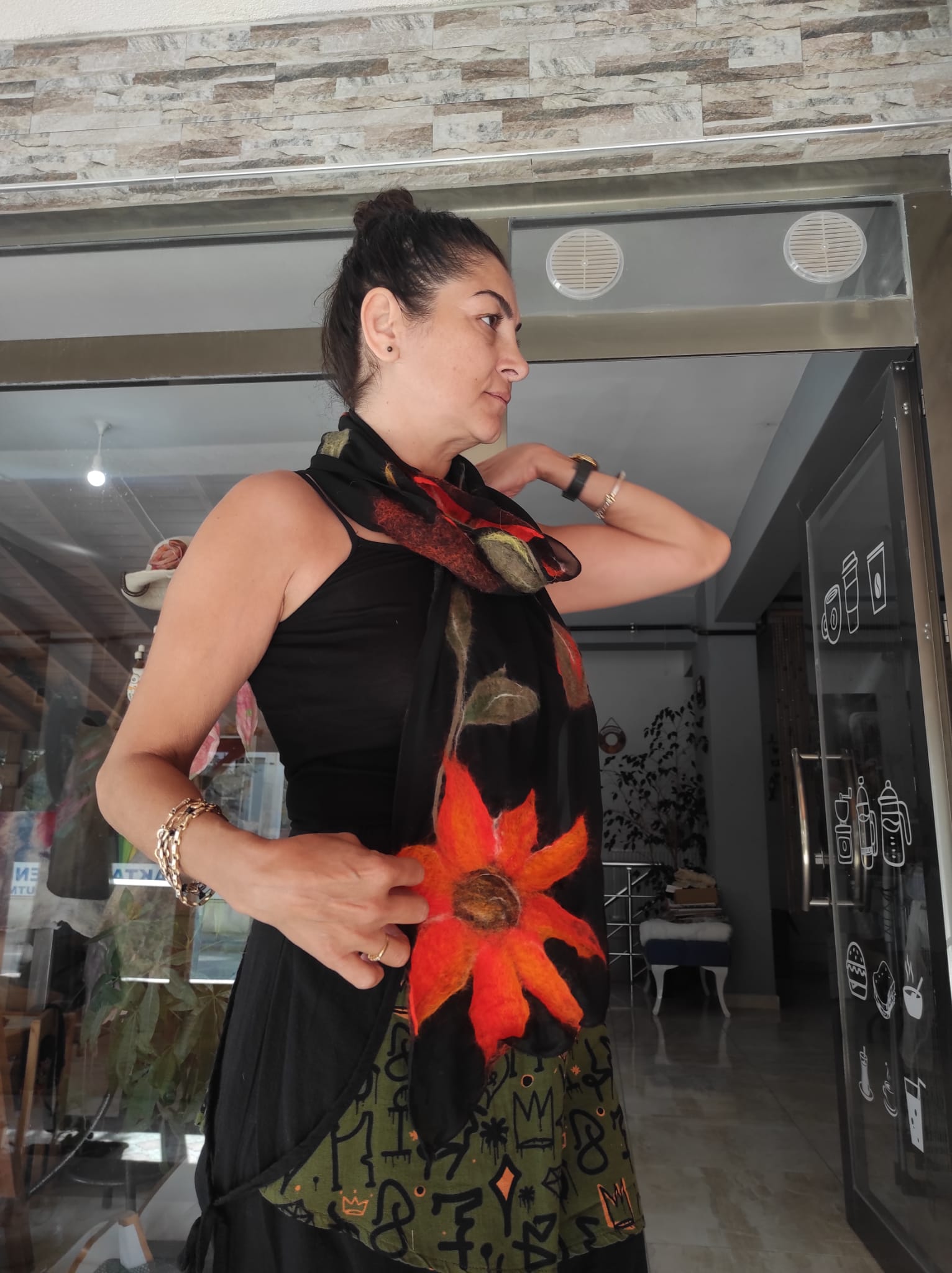 Keçe Ayçicek Desenli El Yapımı Şifon Fulâr, kadınların gardıroplarında olmazsa olmaz aksesuarlardan biridir. Bu şal ile istediğiniz kıyafetinize farklı bir hava katabilir ve tarzınızı yansıtabilirsiniz. Şık bir elbise veya günlük bir gömlek üzerine kolayca kombinlenebilir. Lütfen elde soğuk su ve beyaz sabun ile yıkayın, ütüleyebilirsiniz.